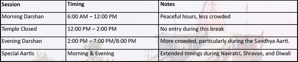 - Darshan Timings: 6:00 AM to 8:00 PM (closed from 12:00 PM to 3:00 PM for bhog and cleaning)