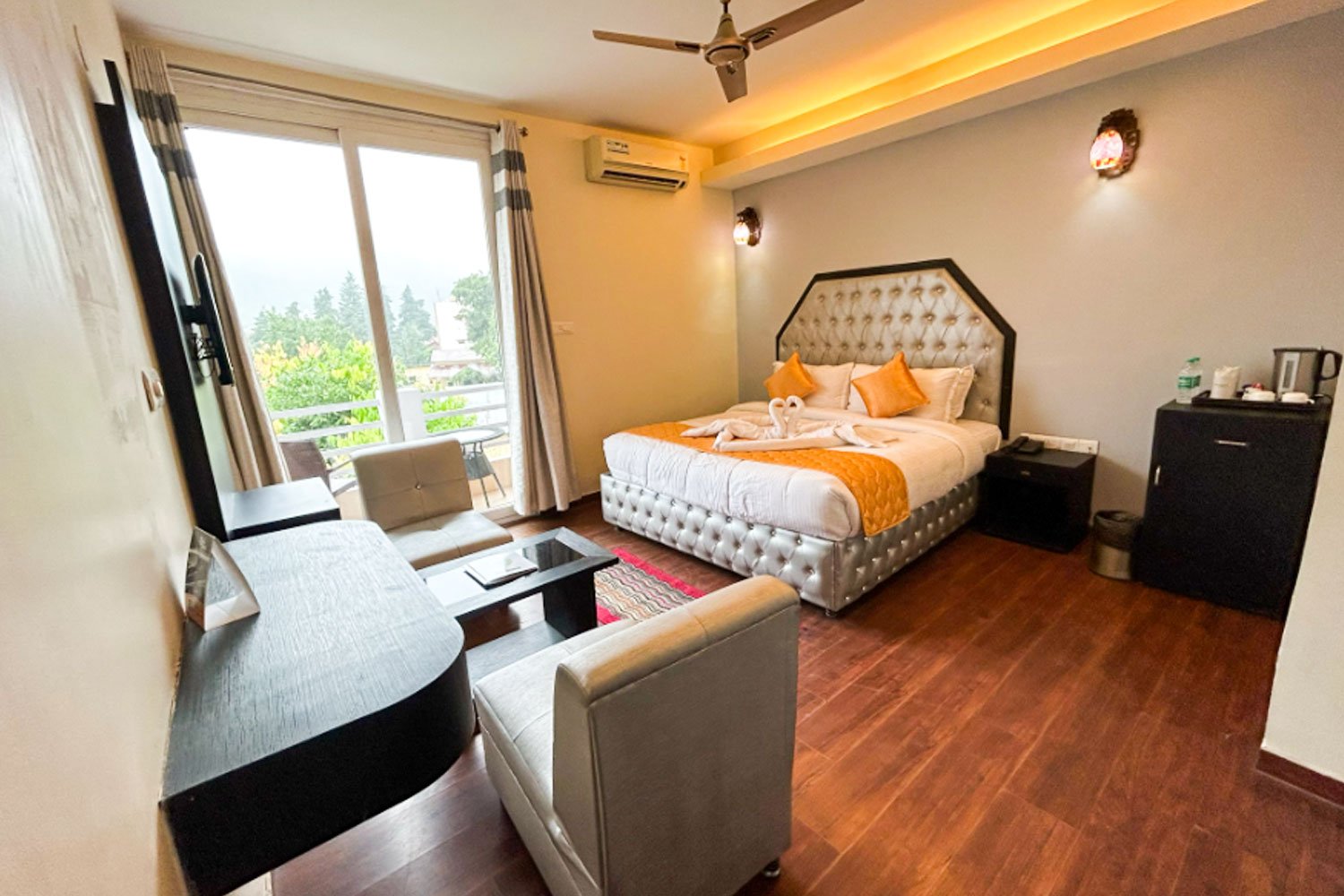 The resort features Premium Rooms, Luxury Rooms, and 2-Bedroom Suites that can comfortably accommodate 3 to 5 adults. Each room is thoughtfully designed with modern amenities such as air conditioning, electric kettle, attached bathrooms with geyser, housekeeping services, ironing facilities, and comfortable double beds. The well-appointed interiors ensure a cozy and relaxing stay experience for every guest.